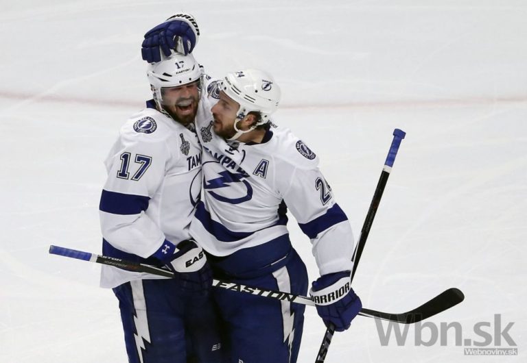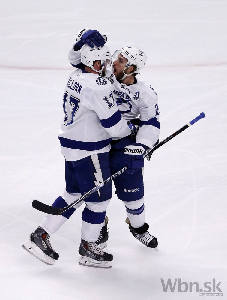 Útočník Tampy Bay Ryan Callahan (24) sa so spoluhráčom Alexom Killornom teší z gólu, ktorý strelil brankárovi Chicaga Blackhawks Coreymu Crawfordovi počas tretieho finálového zápasu NHL, v ktorom 'blesky' zvíťazili 3:2. Chicago, 8 jún 2015. Foto: SITA/AP