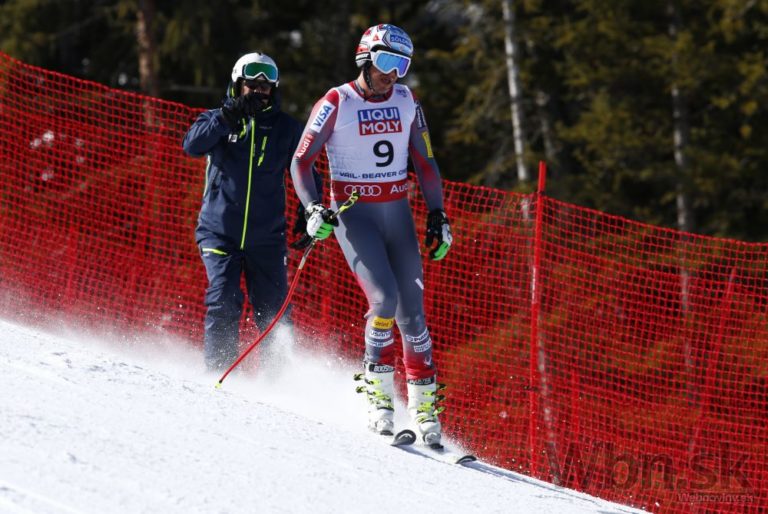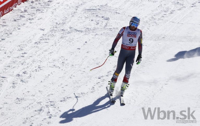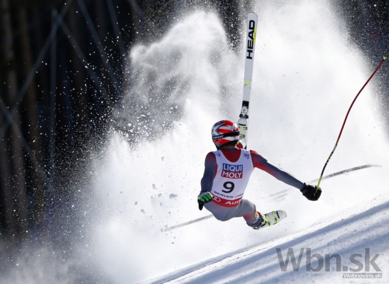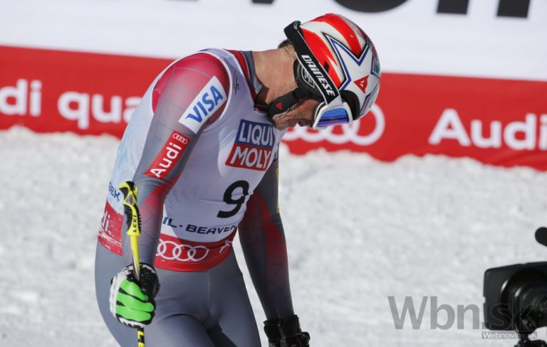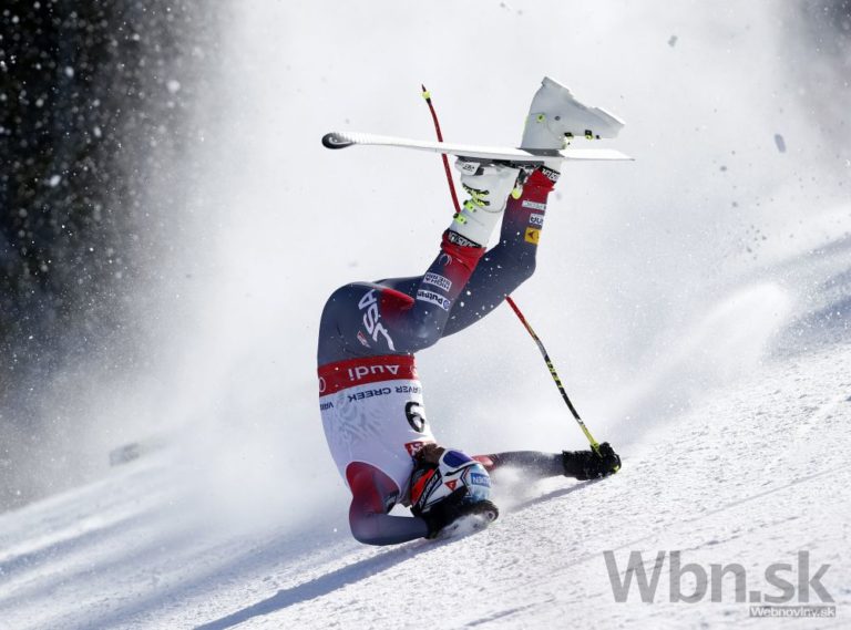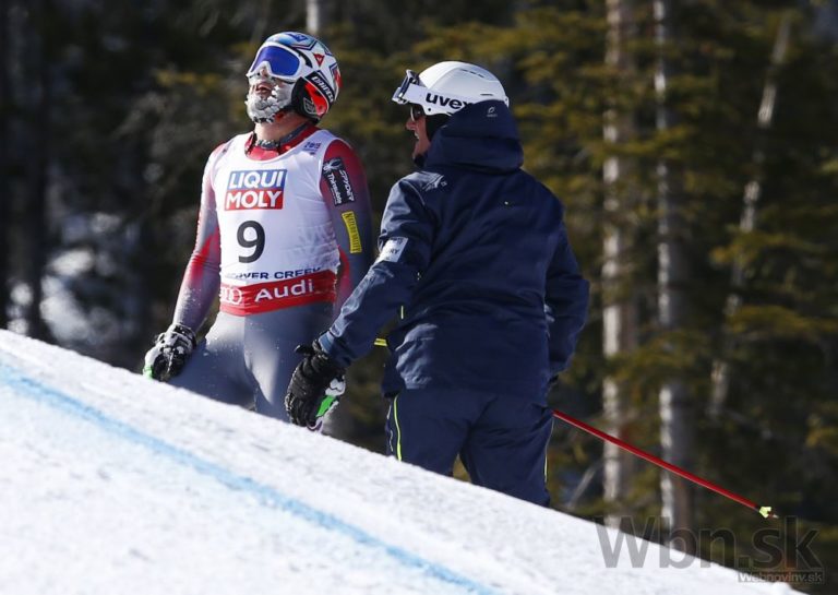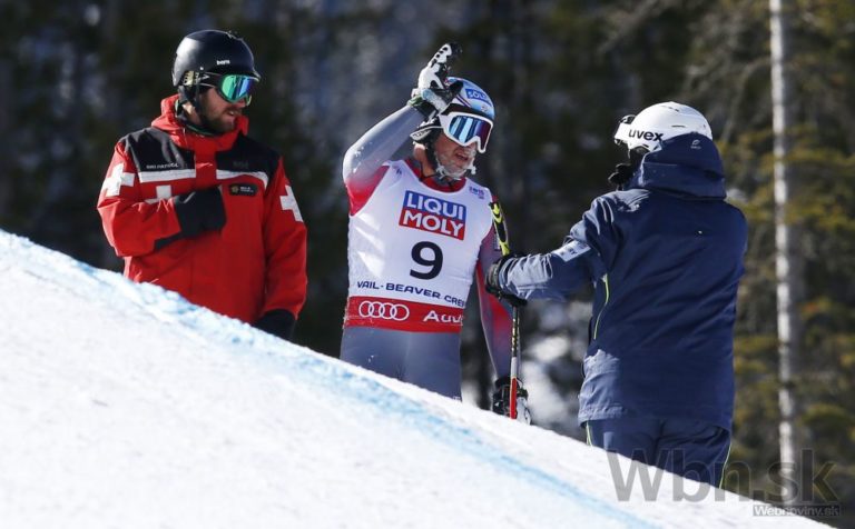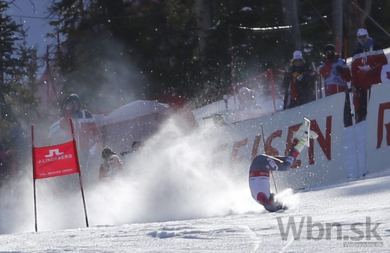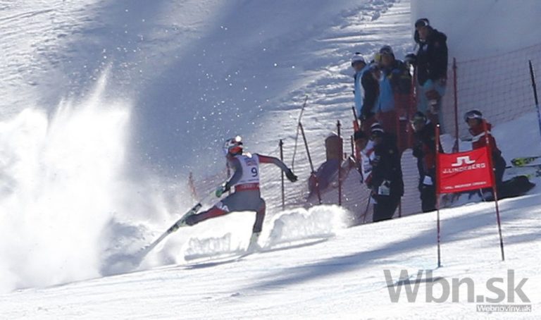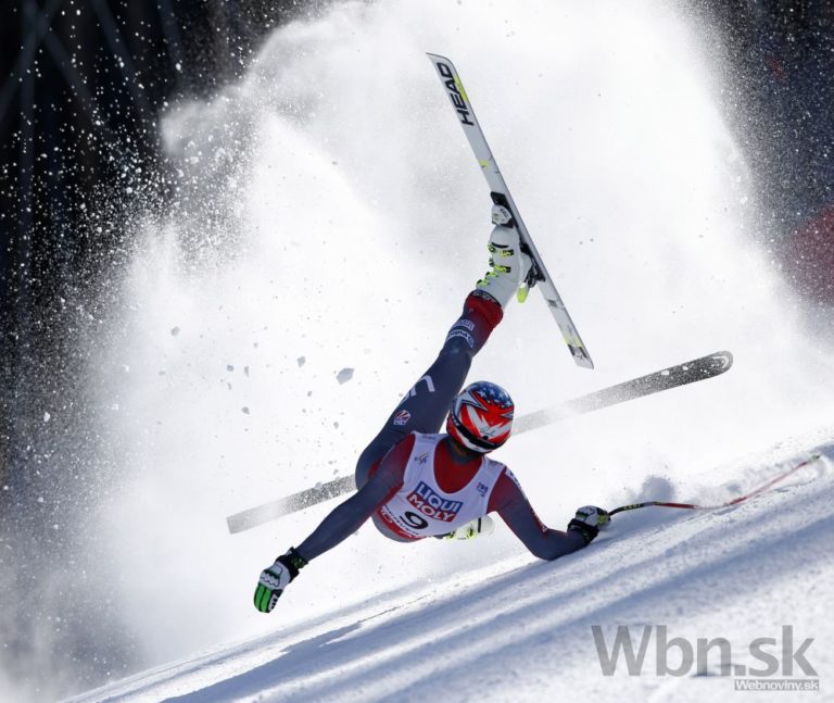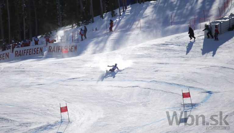 Bode Miller na prvých troch medzičasoch viedol, ale potom zachytil rukou bránku tak nebezpečne, že ho pretočilo a nasledoval pád, pri ktorom mu našťastie vypli lyže a do cieľa prišiel po svojich, pravdepodobne však s reznou ranou na nohe. Foto: SITA/AP