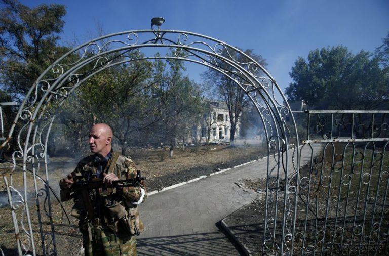 Proruský separatista stojí na stráži pred nemocnicou v obci Novosvitlivka na východe Ukrajiny. Foto: SITA/AP