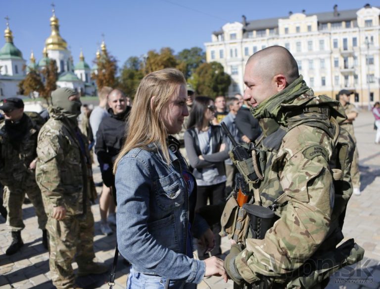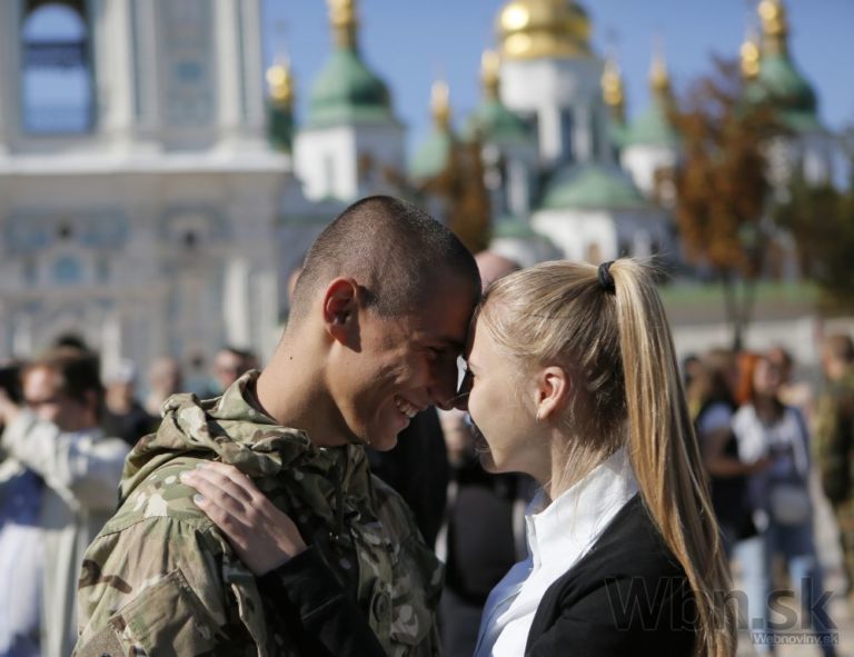 Mladý bojovník z Azovzho dobrovoľníckeho bataliónu sa rozpráva so svojou priateľkou tesne po svojom návrate z roty v Kyjeve. Foto: SITA/AP