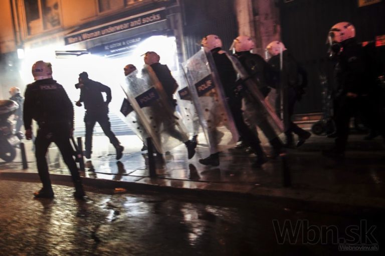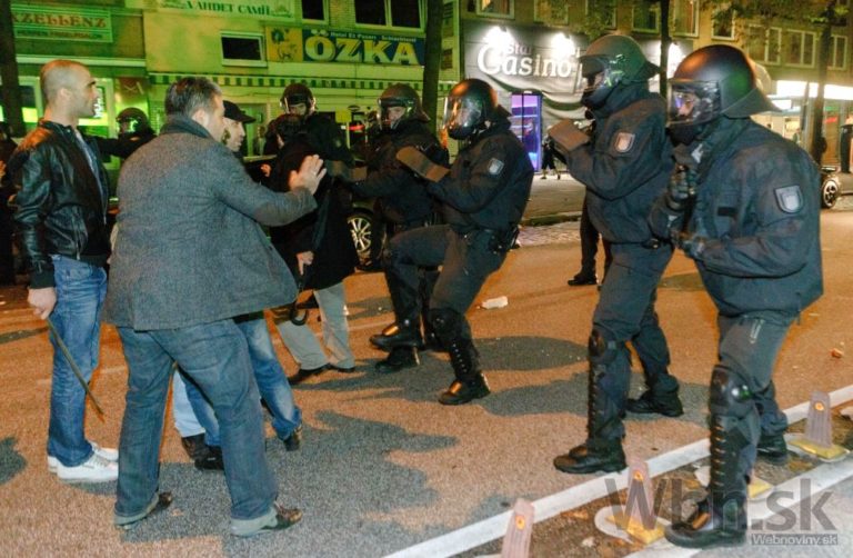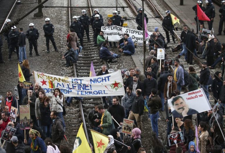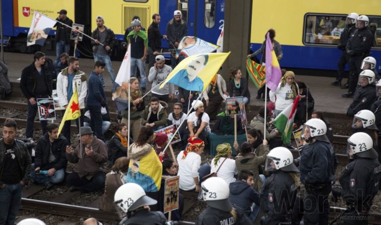 Nočné zrážky medzi kurdskými demonštrantami a prívržencami radikálneho islamského hnutia v Hamburgu si vyžiadali najmenej 14 zranených. Podobné protesty kurdov sa konali v utorok naprieč Európou (Nemecko, Hamburg 8. októbra 2014). Foto: SITA/AP