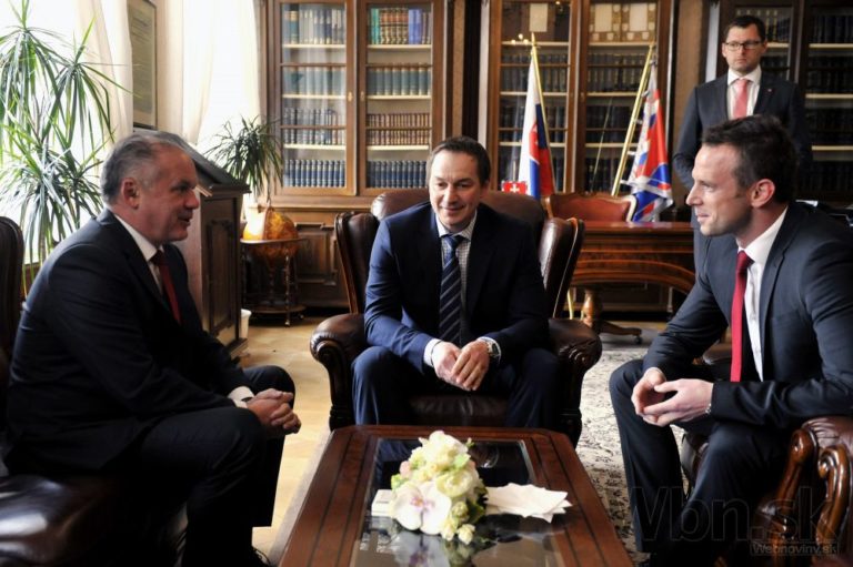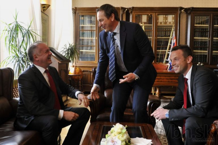 Prezident Andrej Kiska (uprostred) a bývalí hokejisti Peter Bondra (vľavo) a Richard Lintner (vpravo) počas prijatia v Prezidentskom paláci. Bratislava,13. apríl 2015. Foto: SITA/Ján Slovák