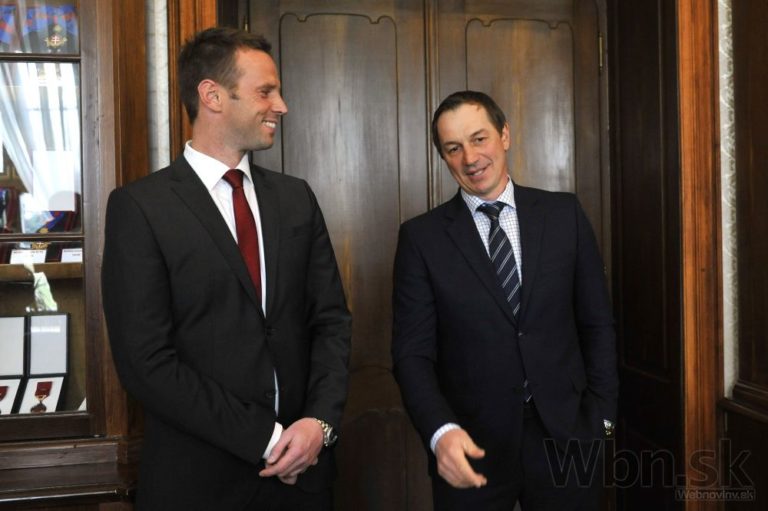 Bývalí hokejisti Peter Bondra (vpravo) a Richard Lintner počas čakania na stretnutie s prezidentom Andrejom Kiskom v Prezidentskom paláci. Bratislava,13. apríl 2015. Foto: SITA/Ján Slovák