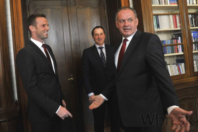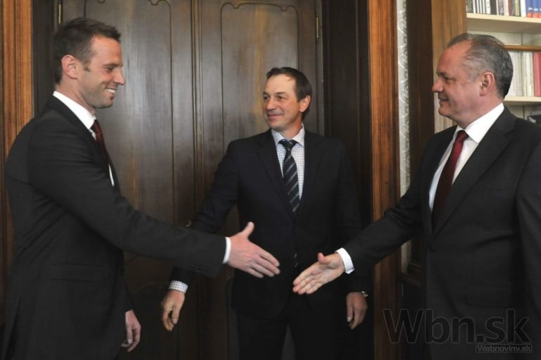 Sprava: Prezident Andrej Kiska a bývalí hokejisti Peter Bondra a Richard Lintner počas prijatia v Prezidentskom paláci. Bratislava,13. apríl 2015. Foto: SITA/Ján Slovák