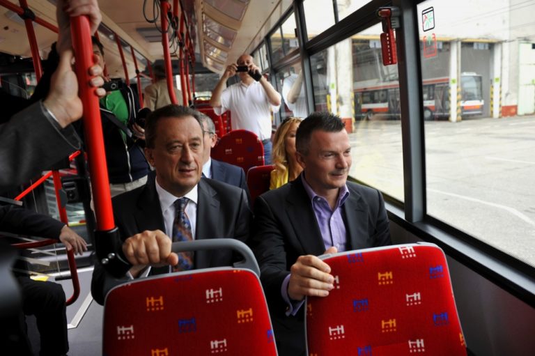 Zľava: Riaditeľ DPB Ľubomír Belfi a minister dopravy, výstavby a regionálneho rozvoja Ján Počiatek počas predstavenia prvých nových trolejbusov v rámci obnovy vozového parku Dopravného podniku Bratislava. Foto: SITA/Ján Slovák