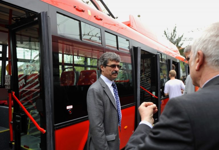 Primátor Bratislavy Milan Ftáčnik počas predstavenia prvých nových trolejbusov v rámci obnovy vozového parku Dopravného podniku Bratislava. Foto: SITA/Ján Slovák