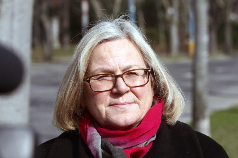 Veľvyslankyňa Nórskeho kráľovstva na Slovensku Inge Magistad počas TB na tému: Obnova aleje pri Námestí Slobody. Bratislava, 12. marec 2017. Foto: SITA/Peter Maďar