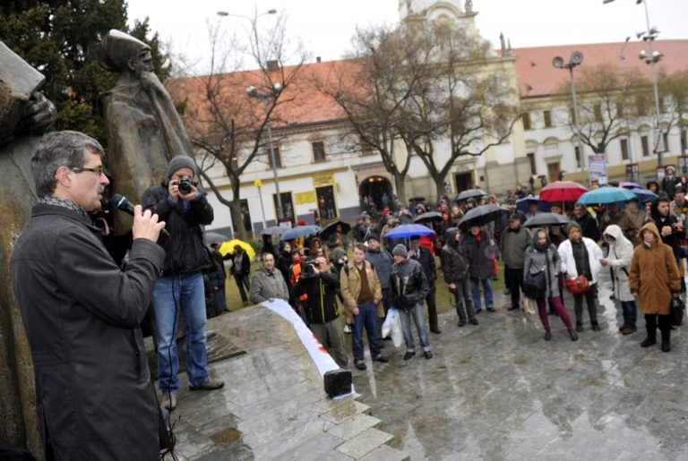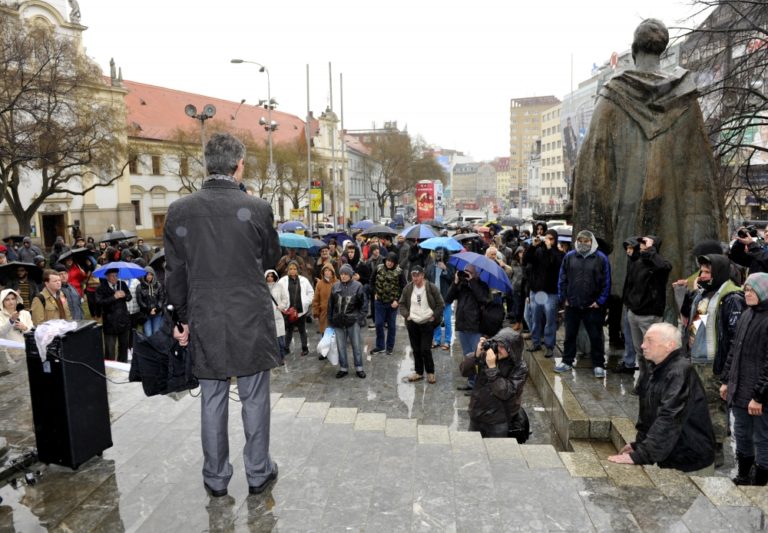 Zvolávateľ akcie Robert Mihály (vpravo) počas verejného zhromaždenia proti prejavom neznášanlivosti, extrémizmu a beztrestného šírenia ideológie fašizmu či rasizmu na Námestí SNP. Bratislava, 15. marec 2014. Foto: SITA/Ján Slovák