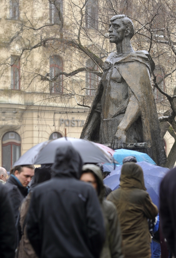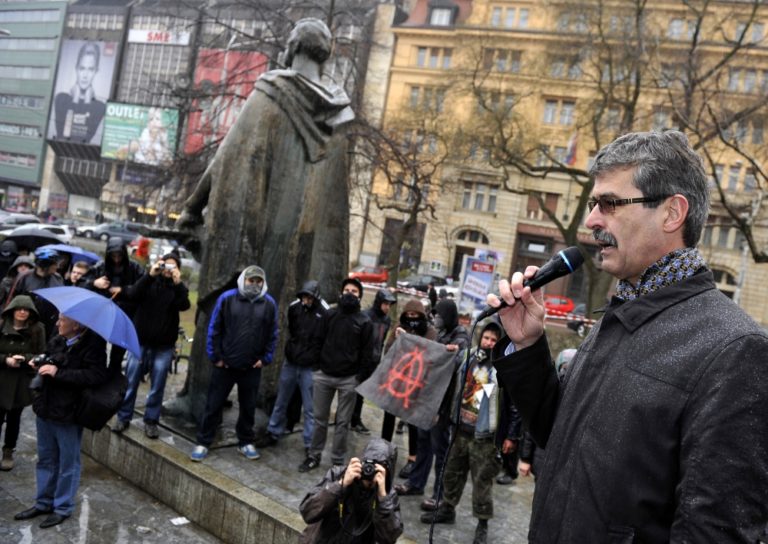 Primátor mesta Bratislava Milan Ftáčnik (vľavo) počas verejného zhromaždenia proti prejavom neznášanlivosti, extrémizmu a beztrestného šírenia ideológie fašizmu či rasizmu na Námestí SNP. Bratislava, 15. marec 2014. Foto: SITA/Ján Slovák