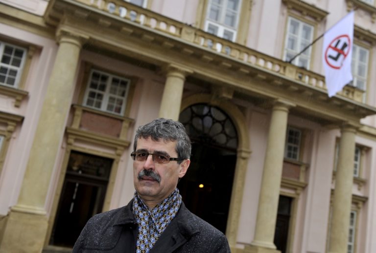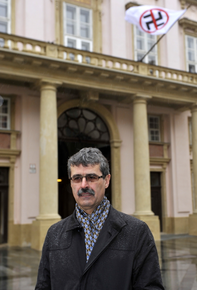 Primátor mesta Bratislava Milan Ftáčnik pred budovou magistrátu s vyvesenou antifašistickou zástavou počas verejného zhromaždenia proti prejavom neznášanlivosti, extrémizmu a beztrestného šírenia ideológie fašizmu či rasizmu na Námestí SNP. Bratislava, 15. marec 2014. Foto: SITA/Ján Slovák