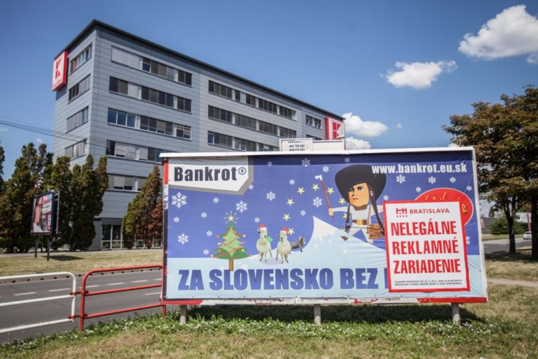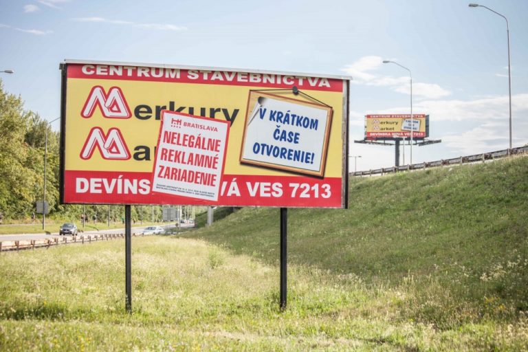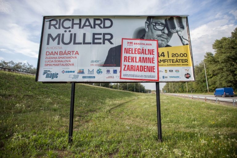 Upozornenia na nelegálne reklamy sa na bilbordoch v Bratislave objavili cez víkend (5. až 6. júla), ide o reklamné zariadenia, ktoré s mestom nemajú uzavreté nájomné zmluvy, stoja však na pozemkoch mesta. Bratislava, 15. júl 2014. Foto: SITA/Katarína Acelová