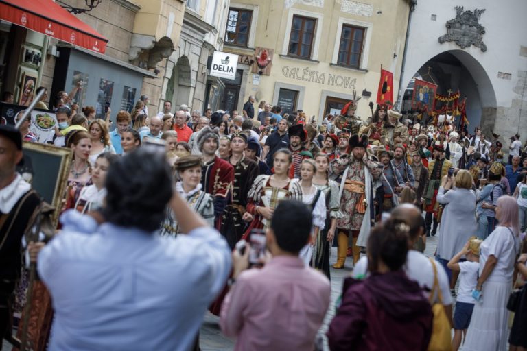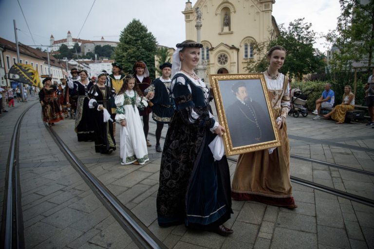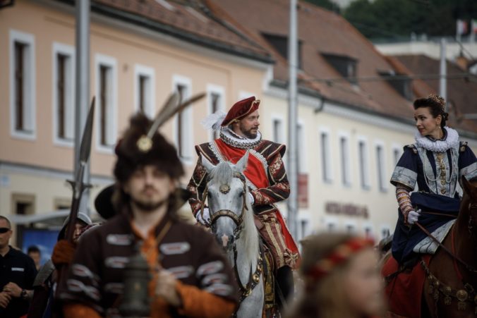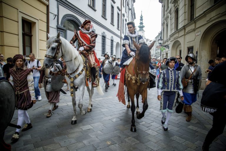 Korunovačný sprievod Maximiliána II. Habsburského na Baštovej ulici počas podujatia Bratislavské korunovačné dni 2020 v rámci osláv kráľovskej minulosti Bratislavy. Bratislava, 16. august 2020. Foto: SITA/Branislav Bibel