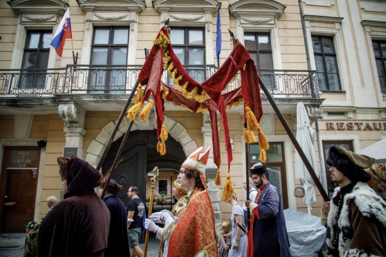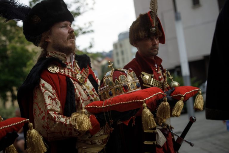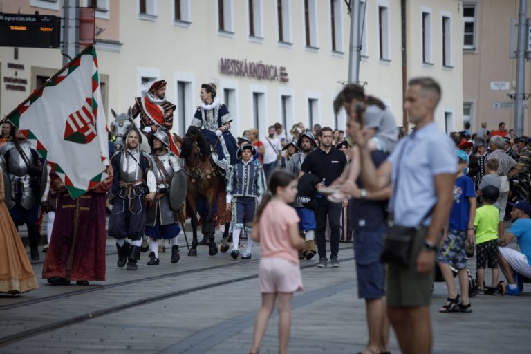 Korunovačný sprievod ulicami Starého Mesta počas podujatia Bratislavské korunovačné dni 2020 v rámci osláv kráľovskej minulosti Bratislavy. Bratislava, 16. august 2020. Foto: SITA/Branislav Bibel
