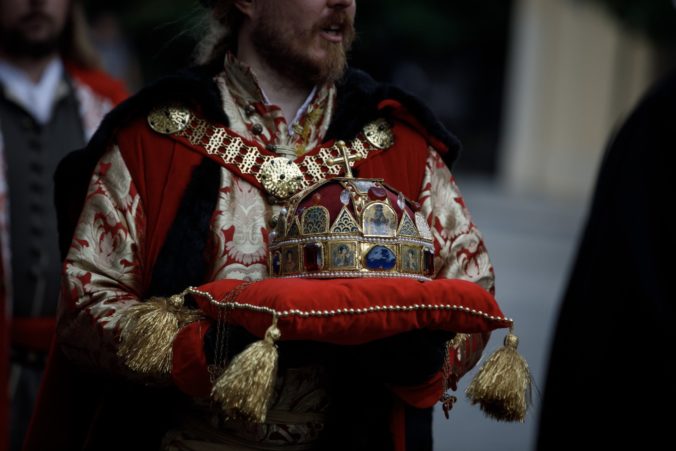 Pohľad na korunovačné insígnie počas korunovačného sprievodu Maximiliána II. Habsburského pri príležitosti podujatia Bratislavské korunovačné dni 2020 v rámci osláv kráľovskej minulosti Bratislavy. Bratislava, 16. august 2020. Foto: SITA/Branislav Bibel