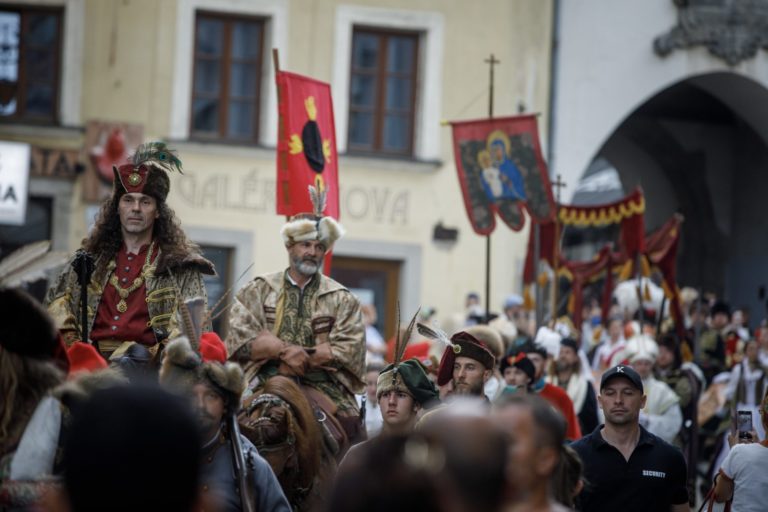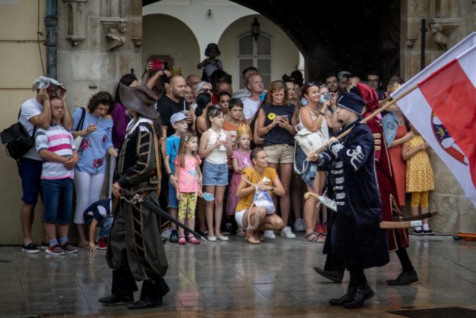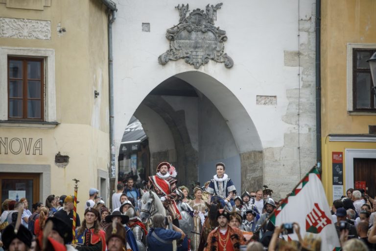 Korunovačný sprievod Maximiliána II. Habsburského pod Michalskou bránou počas podujatia Bratislavské korunovačné dni 2020 v rámci osláv kráľovskej minulosti Bratislavy. Bratislava, 16. august 2020. Foto: SITA/Branislav Bibel