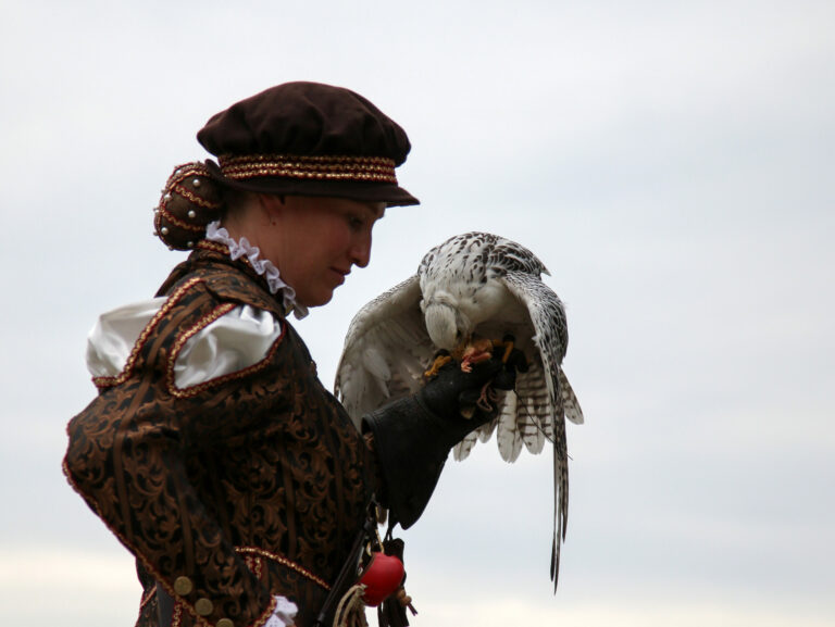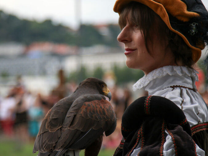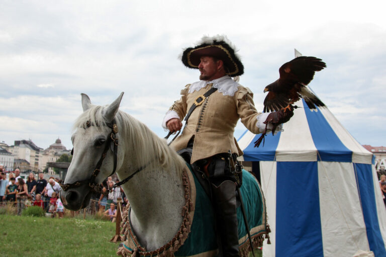 Sokoliarka s koňom počas podujatia Bratislavské korunovačné dni 2025 na Tyršovom nábreží. Bratislava, 25. júl 2025. Foto: SITA/Andrea Mezeiová