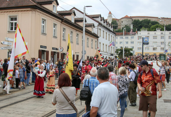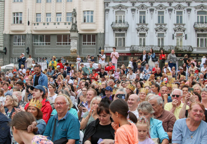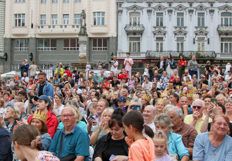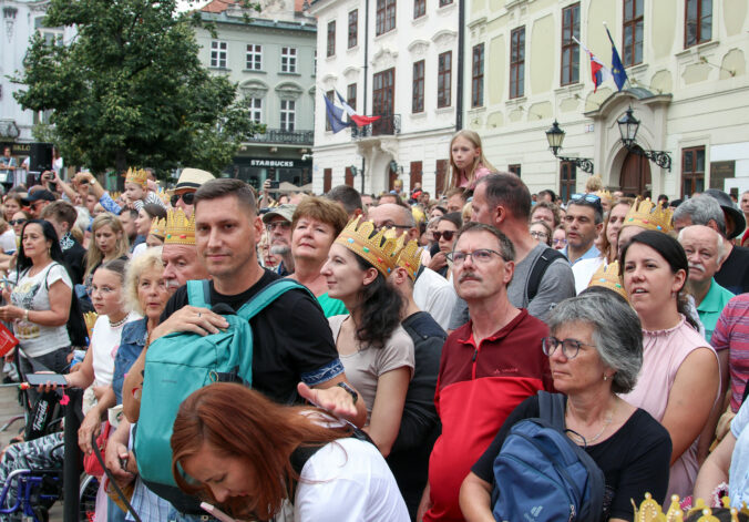 Diváci počas rekonštrukcie obradu korunovácie Karola III. v roku 1712 na Hlavnom námestí v Bratislave v rámci podujatia Bratislavské korunovačné dni 2025. Bratislava, 26. júl 2025. Foto: SITA/Andrea Mezeiová