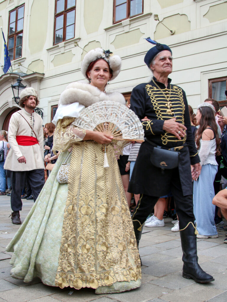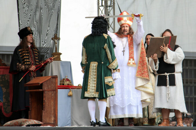 Herec Branislav Deák (v popredí vľavo) predstavujúci uhorského panovníka Karola III. počas rekonštrukcie obradu korunovácie Karola III. v roku 1712 na Hlavnom námestí v Bratislave v rámci podujatia Bratislavské korunovačné dni 2025. Bratislava, 26. júl 2025. Foto: SITA/Andrea Mezeiová