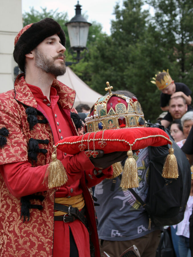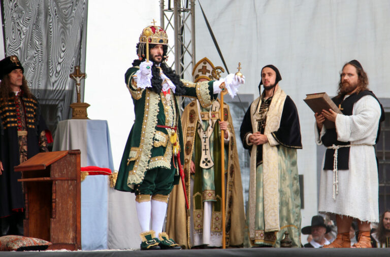 Herec Branislav Deák (v popredí) predstavujúci uhorského panovníka Karola III. počas rekonštrukcie obradu korunovácie Karola III. v roku 1712 na Hlavnom námestí v Bratislave v rámci podujatia Bratislavské korunovačné dni 2025. Bratislava, 26. júl 2025. Foto: SITA/Andrea Mezeiová