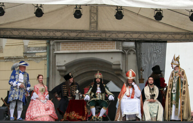 Herec Branislav Deák (uprostred) predstavujúci uhorského panovníka Karola III. počas rekonštrukcie obradu korunovácie Karola III. v roku 1712 na Hlavnom námestí v Bratislave v rámci podujatia Bratislavské korunovačné dni 2025. Bratislava, 26. júl 2025. Foto: SITA/Andrea Mezeiová