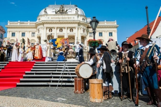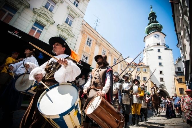 Atmosféra počas korunovačného sprievodu z Bratislavského hradu od Viedenskej brány, ktorý organizovalo občianske združenie Korunovačná Bratislava v rámci Bratislavských korunovačných slávností 2018. Bratislava, 23. jún 2018. Foto: SITA/Branislav Bibel