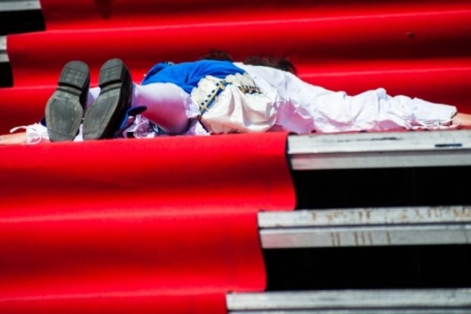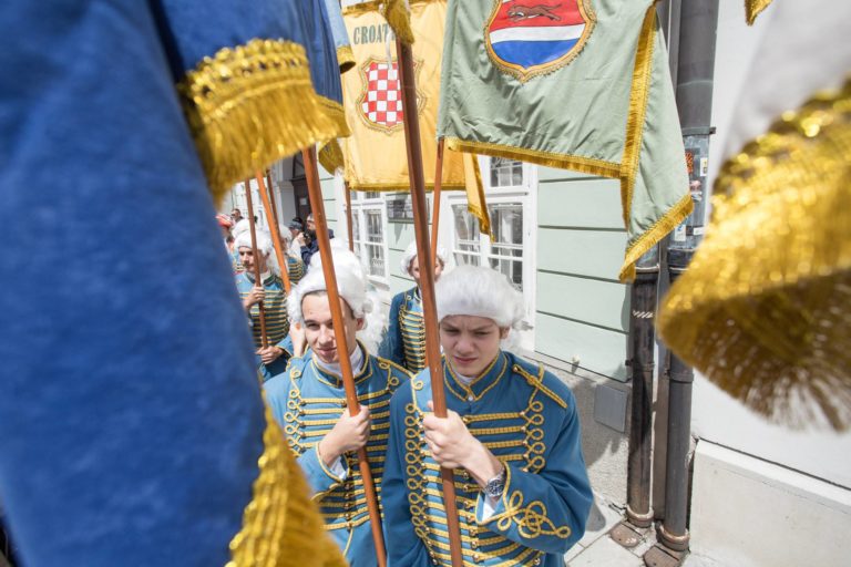 Vlajkonosiči pred obradom korunovácie Leopolda II. v jezuitskom kostole v rámci Bratislavských korunovačných slávností 2018. Bratislava, 23. jún 2018. Foto: SITA/Branislav Bibel