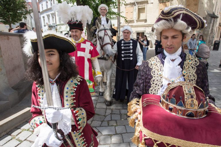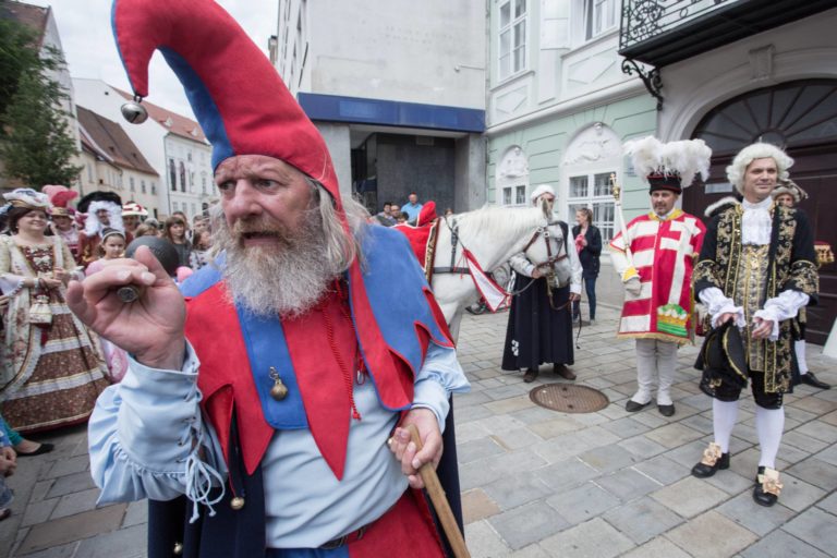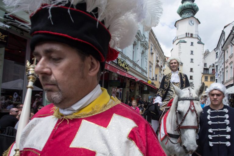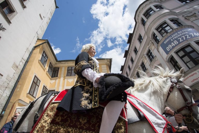 Herec predstavujúci Leopolda II. počas korunovačného sprievodu z Bratislavského hradu od Viedenskej brány, ktorý organizovalo občianske združenie Korunovačná Bratislava v rámci Bratislavských korunovačných slávností 2018. Bratislava, 23. jún 2018. Foto: SITA/Branislav Bibel
