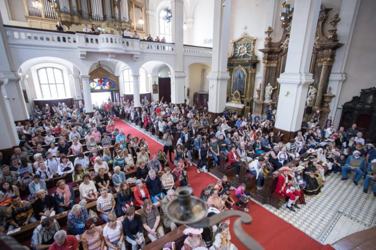 Atmosféra počas obradu korunovácie v jezuitskom kostole v rámci Bratislavských korunovačných slávností 2018. Bratislava, 23. jún 2018. Foto: SITA/Branislav Bibel