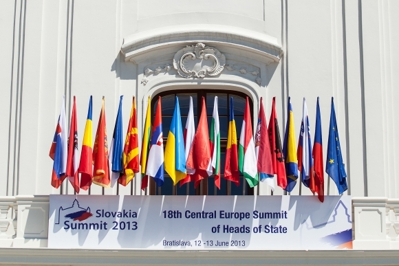 Vlajky na Bratislavskom hrade počas 18. stredoeurópskeho summitu hláv štátov s mottom Stratégiou rastu k pokrízovej obnove. Bratislava, 13. jún 2013. Foto: SITA/Jozef Jakubčo