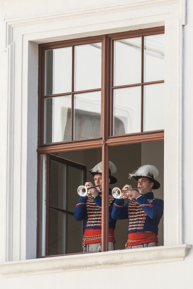 Hudobníci z čestnej stráže prezidenta SR počas 18. stredoeurópskeho summitu hláv štátov s mottom Stratégiou rastu k pokrízovej obnove. Bratislava, 13. jún 2013. Foto: SITA/Jozef Jakubčo