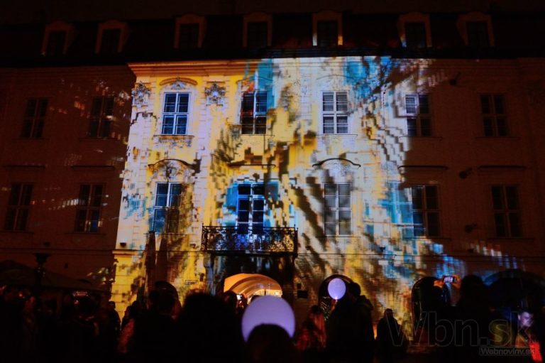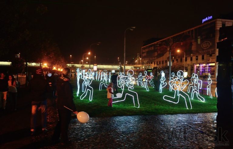 Atmosféra na Hlavnom námestí počas projektu Biela noc 2015 - vizuálne atraktívne inštalácie a digitálne umenie v bratislavskom Starom meste. Na snímke: Svetelná inštalácia Narušitelia, ktorej autorkou je Amanda Parer (AU). Bratislava, 10. október 2015. Foto: SITA/Robert Tappert