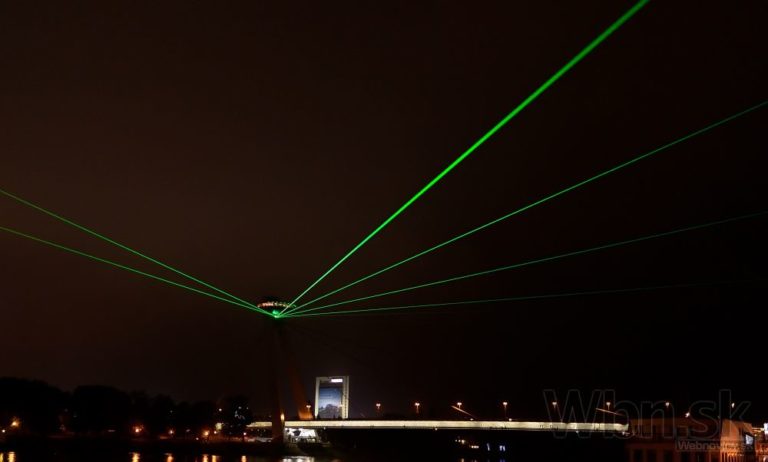 Pohľad na nasvietený most SNP v Bratislave počas projektu Biela noc 2015 - Vizuálne atraktívne inštalácie a digitálne umenie v bratislavskom Starom meste. Na snímke: Laserová inštalácia Tower of light od ILC - Medzinárodné laserové centrum (SK). Bratislava, 10. október 2015. Foto: SITA/Robert Tappert