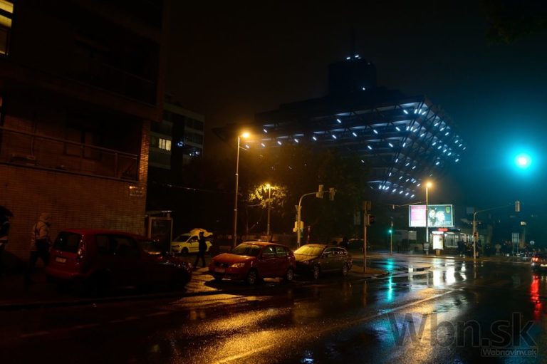Pohľad na budovu Slovenského rozhlasu počas projektu Biela noc 2015 - vizuálne atraktívne inštalácie a digitálne umenie v bratislavskom Starom meste. Na snímke: ARC - Architektonické centrum rehabilitácie od ATK! (BE). Bratislava, 10. október 2015. Foto: SITA/Robert Tappert