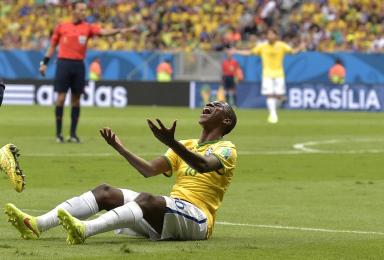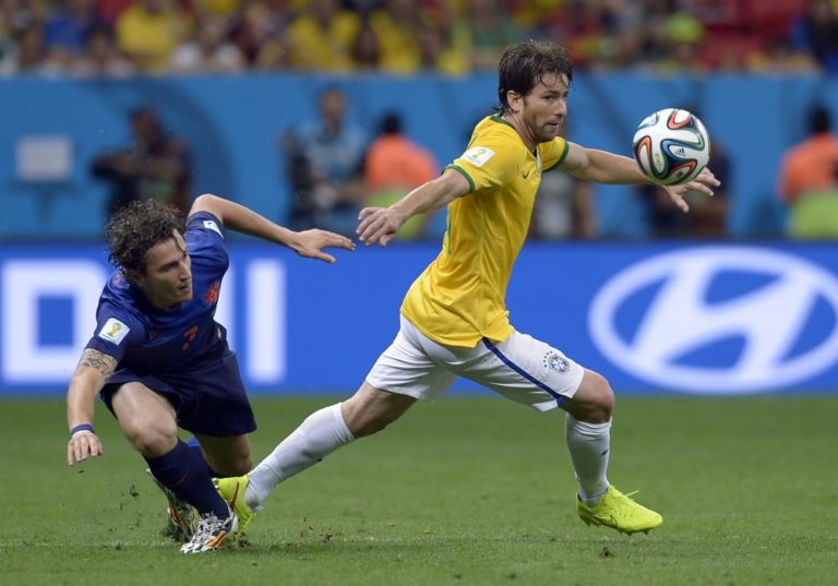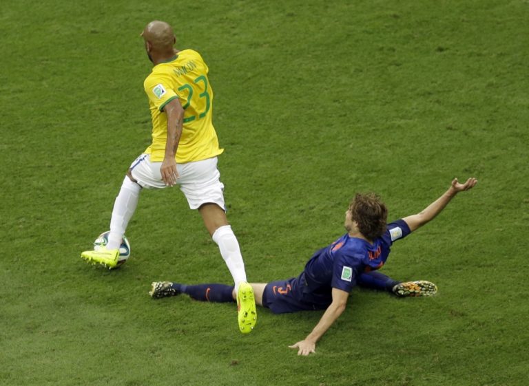 Otrasený Brazílčan Ramires po faule holandského futbalistu Jonathana de Guzmana počas zápasu o tretie miesto na svetovom šampionáte. Foto: SITA/AP