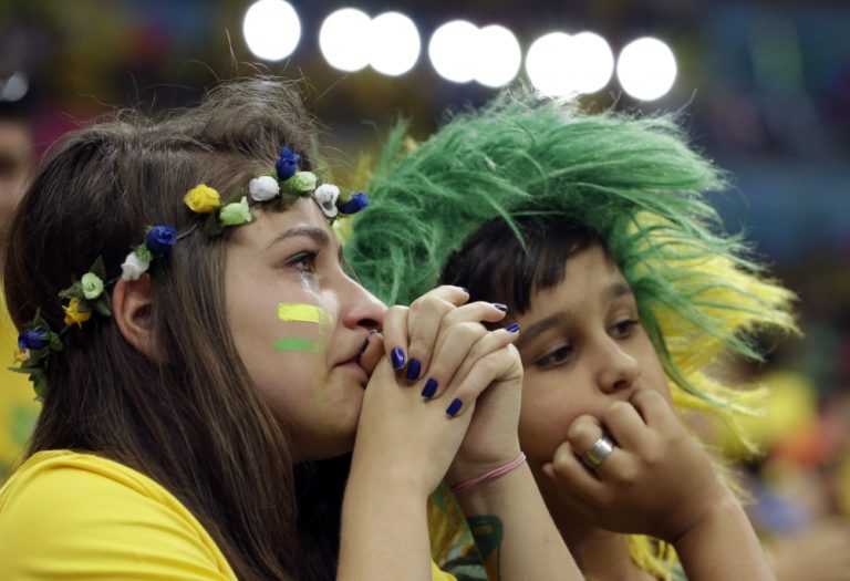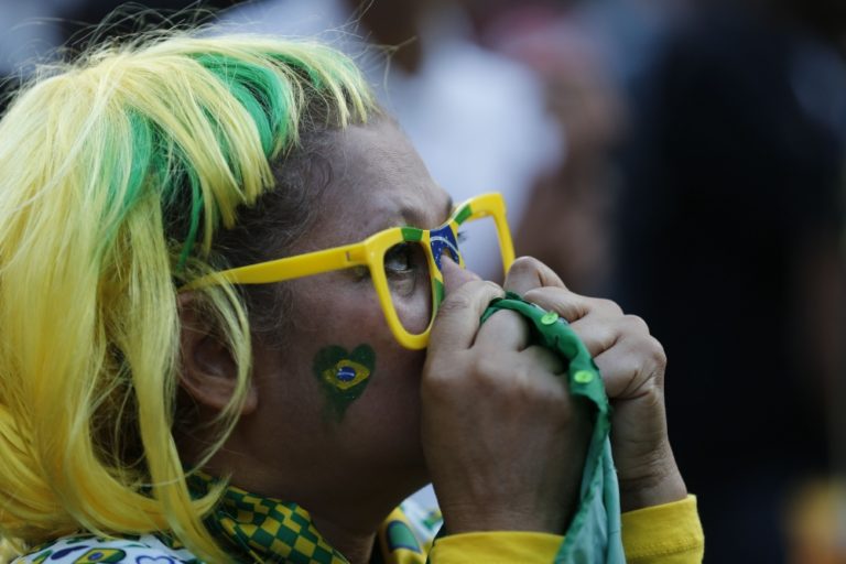 Smutné brazílske fanúšičky po zápase o tretie miesto na XX. majstrovstvách sveta, v ktorom domáci 'kanárici' prehrali s Holandskom 0:3. Foto: SITA/AP