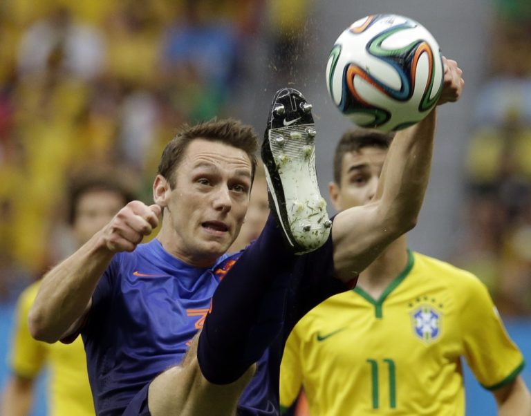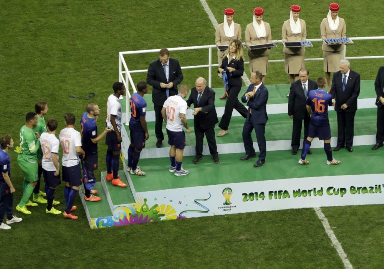 Futbalisti Holandska si preberajú bronzové medaily po zápas o tretie miesto na XX. majstrovstvách sveta, v ktorom porazili domácu Brazíliu 3:0. Foto: SITA/AP