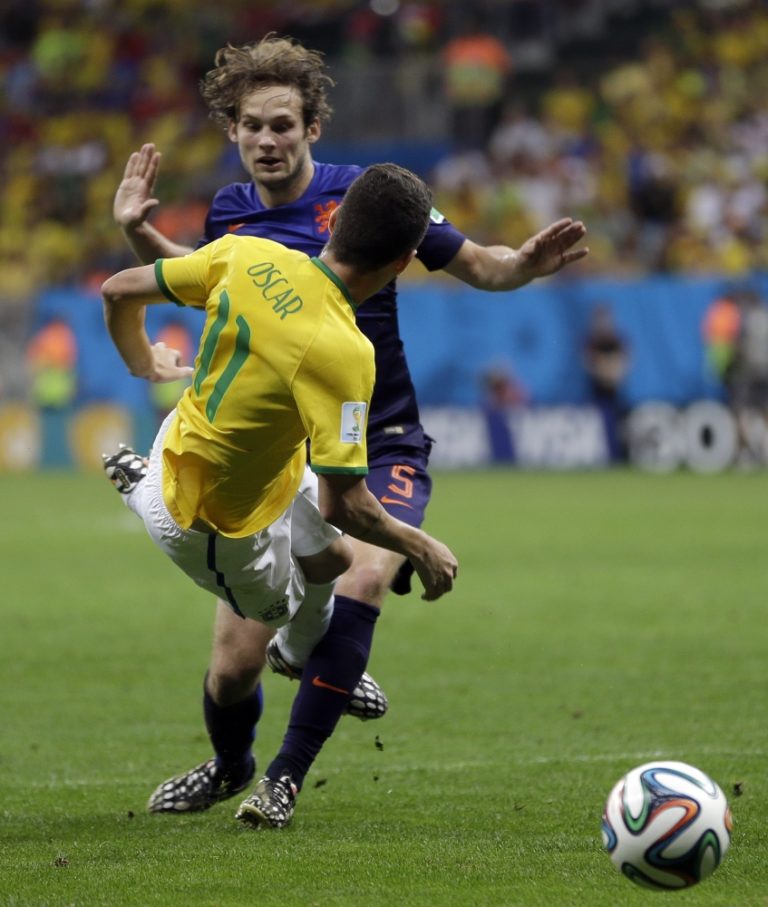 Brazílčan Oscar v súboji s holandským futbalistom Daleyom Blindom počas zápasu o tretie miesto na svetovom šampionáte. Foto: SITA/AP