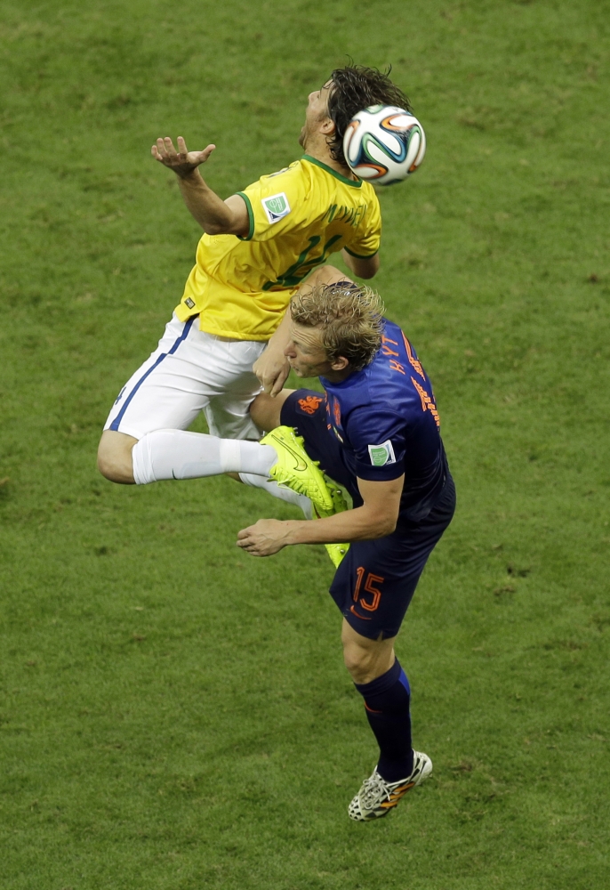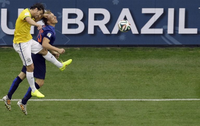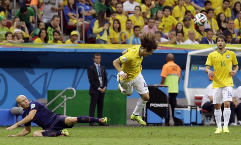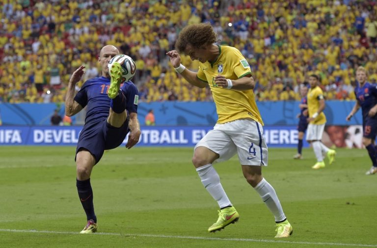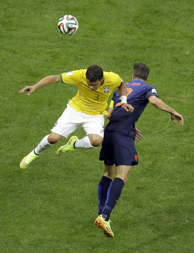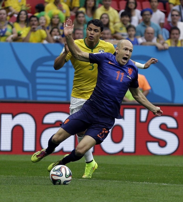 Holanďan Arjen Robben sa pozerá, ako brazílsky futbalista David Luiz hlavičkuje loptu počas zápasu o tretie miesto na svetovom šampionáte. Foto: SITA/AP
