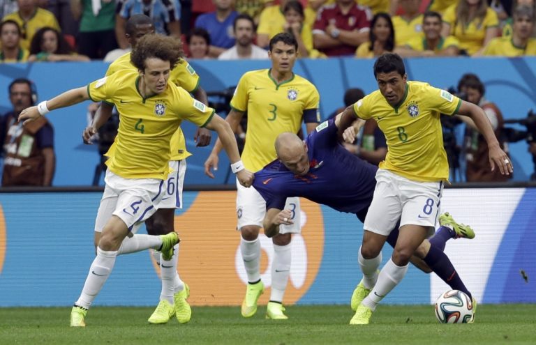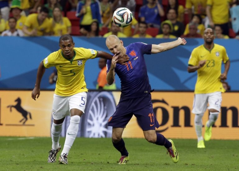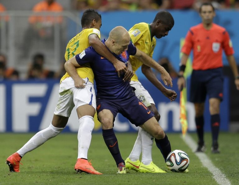 Holanďan Arjen Robben v súboji s brazílskymi futbalistami počas zápasu o tretie miesto na svetovom šampionáte. Foto: SITA/AP