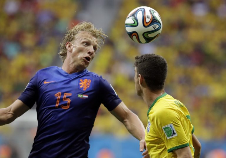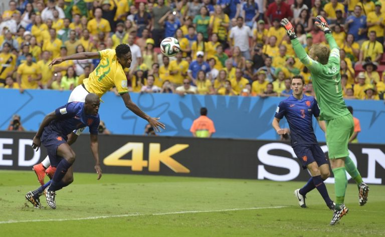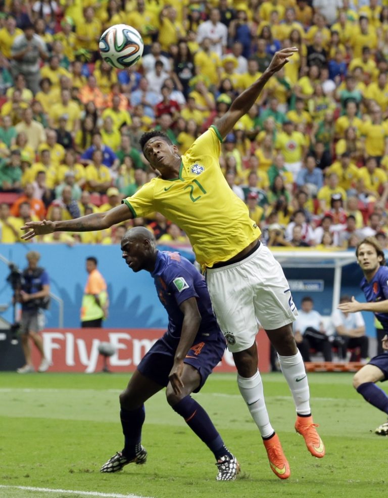 Brazílčan Jo hlavičkuje loptu na holandskú bránku počas zápasu o tretie miesto na svetovom šampionáte. Foto: SITA/AP
