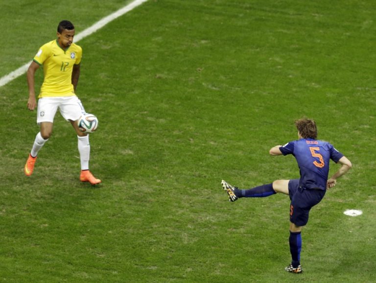 Holandský útočník Robin Van Persie strieľa z pokutového kopu úvodný gól do brazílskej siete počas zápasu o tretie miesto na svetovom šampionáte. Foto: SITA/AP