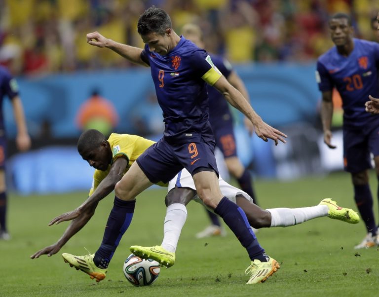 Bývalý holandský útočník Robin Van Persie sa raduje z gólu ktorý strelil do brazílskej siete počas zápasu o tretie miesto na svetovom šampionáte. Foto: Archívne, SITA/AP