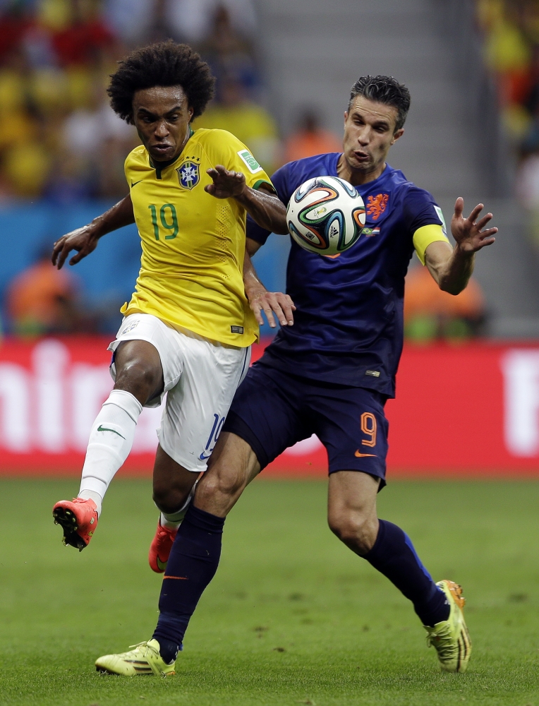 Brazílčania Willian v súboji s holandským kanonierom Robenom Van Persiem počas zápasu o tretie miesto na svetovom šampionáte. Foto: SITA/AP