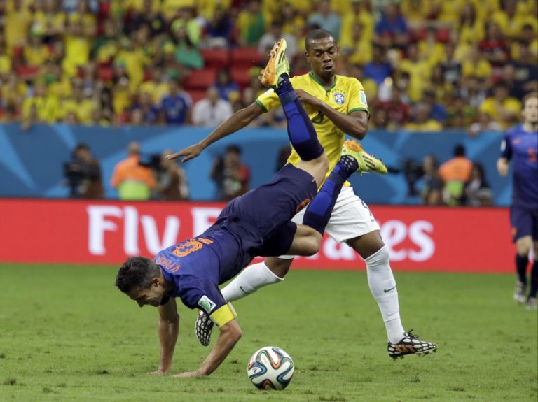 Brazílčan Fernandinho v súboji s holandským futbalistom Robinom Van Persiem počas zápasu o tretie miesto na svetovom šampionáte. Foto: SITA/AP