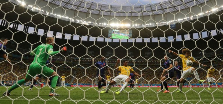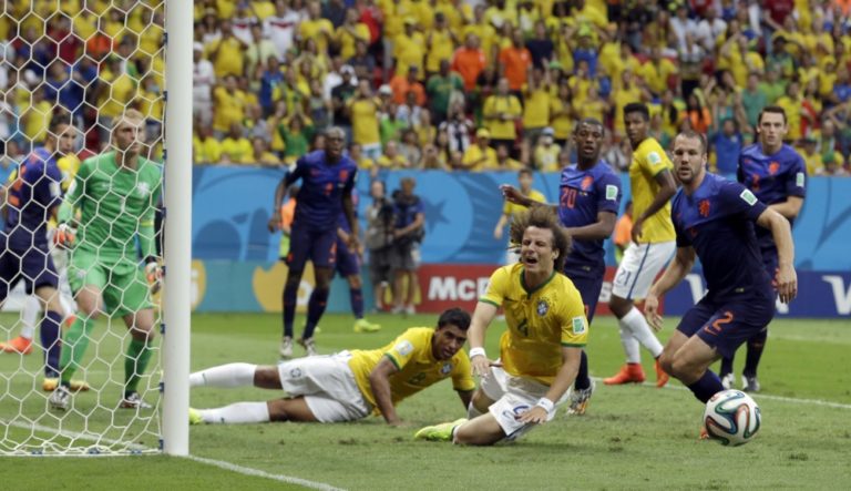 Brazílčan David Luiz sa snaží prekonať holandského brankára počas zápasu o tretie miesto na svetovom šampionáte. Foto: SITA/AP