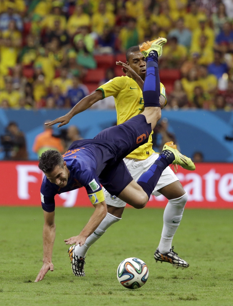 Brazílčania Ramires v súboji s holandským futbalistom Robinom Van Persiem počas zápasu o tretie miesto na svetovom šampionáte. Foto: SITA/AP