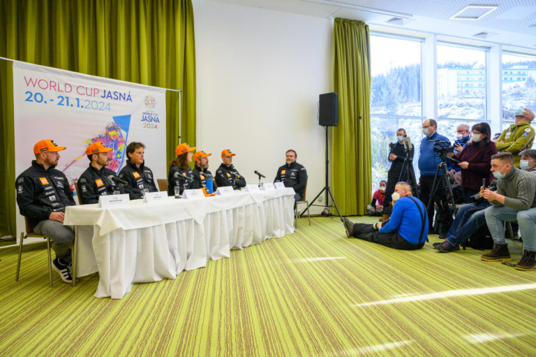 Zľava: Člen Niké Ski Team Petra Vlhová Marco Porta, tréner Petry Vlhovej Mauro Pini a slovenská reprezentantka v zjazdovom lyžovaní Petra Vlhová počas tlačovej konferencie pri príležitosti Mediálneho dňa organizačného tímu Svetového pohára v zjazdovom lyžovaní žien Jasná 2024. Demänovská Dolina, 11. január 2024. Foto: SITA/Milo Fabian