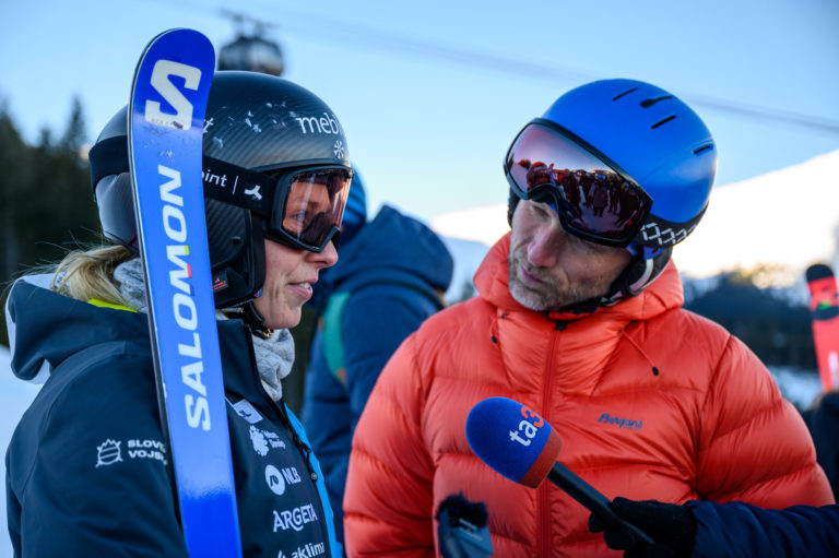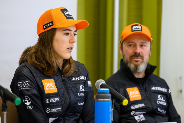 Zľava: Tréner Petry Vlhovej Mauro Pini a slovenská reprezentantka v zjazdovom lyžovaní Petra Vlhová, počas tlačovej konferencie pri príležitosti mediálneho dňa organizačného tímu Svetového pohára v zjazdovom lyžovaní žien Jasná 2024. Demänovská Dolina, 11. január 2024. Foto: archívne, SITA/Milo Fabian