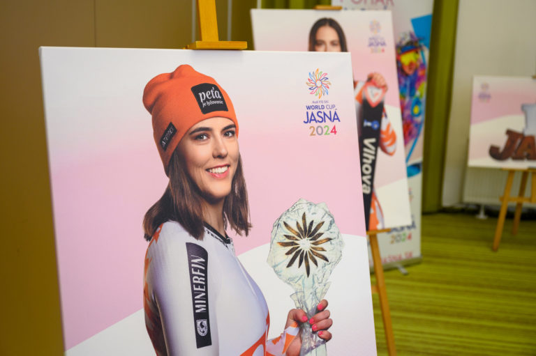 Vizuál s podobou slovenskej reprezentantky v zjazdovom lyžovaní Petry Vlhovej počas tlačovej konferencie organizačného tímu Svetového pohára v zjazdovom lyžovaní žien Jasná 2024. Demänovská Dolina, 11. január 2024. Foto: SITA/Milo Fabian