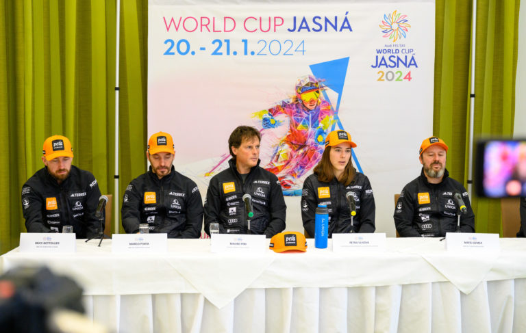 Zľava: Člen Niké Ski Team Petra Vlhová Brice Bottolier, člen Niké Ski Team Petra Vlhová Marco Porta, tréner Petry Vlhovej Mauro Pini, slovenská reprezentantka v zjazdovom lyžovaní Petra Vlhová a člen Niké Ski Team Petra Vlhová Matej Gemza počas tlačovej konferencie pri príležitosti Mediálneho dňa organizačného tímu Svetového pohára v zjazdovom lyžovaní žien Jasná 2024. Demänovská Dolina, 11. január 2024. Foto: SITA/Milo Fabian